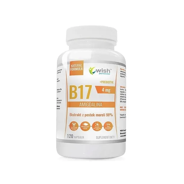Składniki: Inulina Orafti®GR (korzeń cykorii), kapsułka roślinna Vcaps® (celuloza roślinna – hydroksypropylometyloceluloza – składnik otoczki), wyciąg z pestek moreli (Prunus armeniaca L). standaryzowany na 98% amigdaliny.
