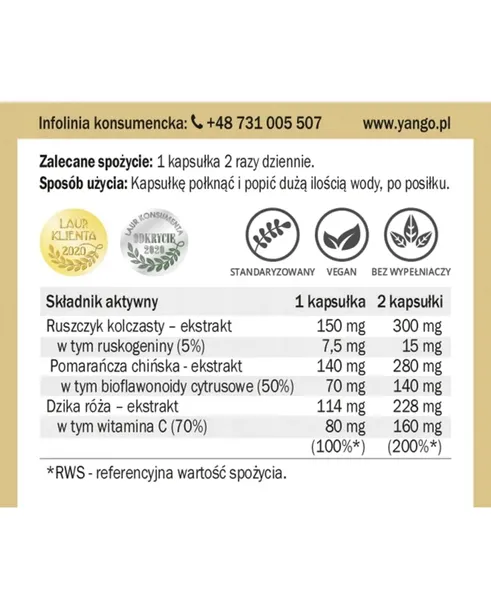Składniki: Ekstrakt z korzenia ruszczyka kolczastego (Ruscus aculeatus) standaryzowany na zawartość min. 5% ruskogeniny, ekstrakt z owoców pomarańczy chińskiej (Citrus sinensis) standaryzowany na zawartość min. 50% bioflawonoidów cytrusowych, ekstrakt z owoców dzikiej róży (Rosa canina) standaryzowany na zawartość min. 70% witaminy C. Skład kapsułki: celuloza roślinna