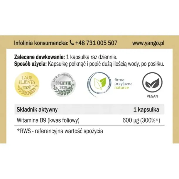 Kwas foliowy - witamina B9 - Yango - 90 kaps.