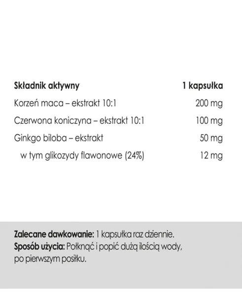 Składniki: Ekstrakt z korzenia maca (Lepidium meyenii) 10:1, ekstrakt z liści czerwonej koniczyny (Trifolium pratense) 10:1, ekstrakt z miłorzębu japońskiego (Ginkgo biloba) standaryzowany na zawartość min. 24% glikozydów flawonowych, inulina. Skład kapsułki: celuloza roślinna (wegetariańskie) Podmiot odpowiedzialny: SSL Sp. z o.o. ul. Granitowa 3/14, 02-681 Warszawa. Wyprodukowano w UE. Masa netto: 24,5 g.
