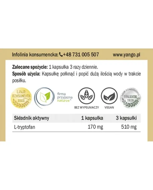 Skład: L-tryptofan. Skład kapsułki: Celuloza roślinna (wegetariańskie)
