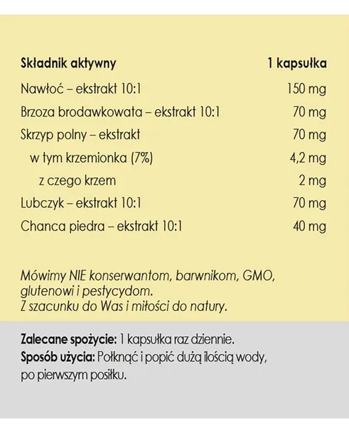 Składniki: ekstrakt z ziela nawłoci (Solidago virgaurea) 10:1, ekstrakt z liści brzozy brodawkowatej (Betula pendula) 10:1, ekstrakt z ziela skrzypu polnego (Equisetum arvense) standaryzowany na zawartość min. 7% krzemionki, ekstrakt z korzenia lubczyku ogrodowego (Levisticum officinale) 10:1, ekstrakt z części naziemnych chanca piedra (Phyllanthus niruri) 10:1.