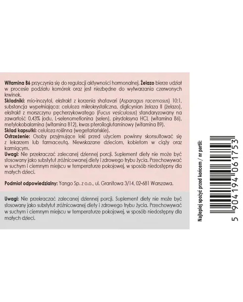 Składniki: mio-inozytol, ekstrakt z korzenia shatavari (Asparagus racemosus) 10:1, substancja wypełniająca: celuloza mikrokrystaliczna, diglicynian żelaza II (żelazo), ekstrakt z morszczynu pęcherzykowatego (Fucus vesiculosus) standaryzowany na zawartość 0,43% jodu, L-selenometionina (selen), pirydoksyna HCL (witamina B6), metylokobalamina (witamina B12), kwas pteroiloglutaminowy (witamina B9).