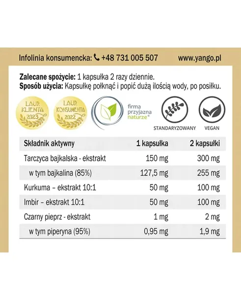 Składniki: Ekstrakt z tarczycy bajkalskiej (Scutellaria baicalensis) standaryzowany na zawartość 85% bajkaliny, ekstrakt z kłącza kurkumy (Curcuma longa) 10:1, ekstrakt z kłącza imbiru (Zingiberis rhizoma) 10:1, inulina, ekstrakt z owoców czarnego pieprzu (Piper nigrum) standaryzowany na zawartość 95% piperyny. Skład kapsułki: celuloza roślinna.Podmiot odpowiedzialny: YANGO Sp. z o.o. ul. Granitowa 3/14, 02-681 Warszawa. Wyprodukowano w UE.