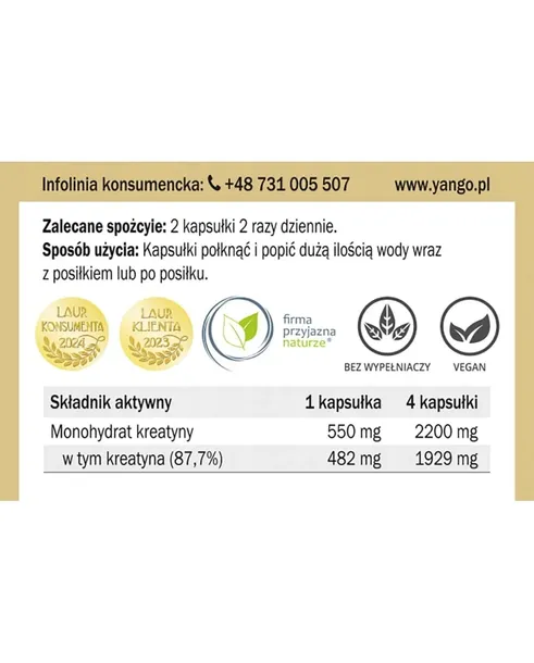 YANGO Kreatyna — Monohydrat w kapsułkach to suplement polecany sportowcom i wszystkim tym, którzy chcą zwiększyć swoją siłę i wytrzymałość mięśniową. Dzięki wegańskiemu składowi jest odpowiednia również dla osób na diecie roślinnej.