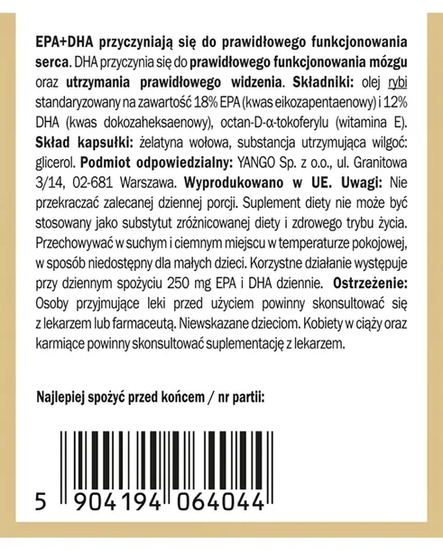 Yango® Omega 3 1000 mg to idealny wybór dla osób dbających o zdrowie serca, mózgu i wzroku. Wzbogać swoją dietę o wysokiej jakości kwasy tłuszczowe omega-3 i ciesz się lepszym zdrowiem i samopoczuciem!