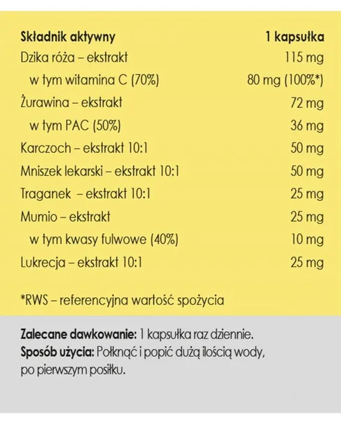 Składniki: Ekstrakt z owoców dzikiej róży (Rosa canina) standaryzowany na zawartość min. 70% witaminy C, ekstrakt z owoców żurawiny (Vaccinium macrocarpon) standaryzowany na zawartość min. 50% proantocyjanidyn (PAC), ekstrakt z karczocha (Cynara scolymus) 10:1, substancja wypełniająca: inulina z korzenia cykorii (prebiotyk), ekstrakt z korzenia mniszka lekarskiego (Taraxacum officinale) 10:1, ekstrakt z korzenia traganka (Astragalus membranaceus) 10:1, ekstrakt z mumio (Shilajit) standaryzowany na zawartość min. 40% kwasów fulwowych, ekstrakt z korzenia lukrecji (Glycyrrhiza gabra) 10:1. Skład kapsułki: celuloza roślinna (wegetariańskie)