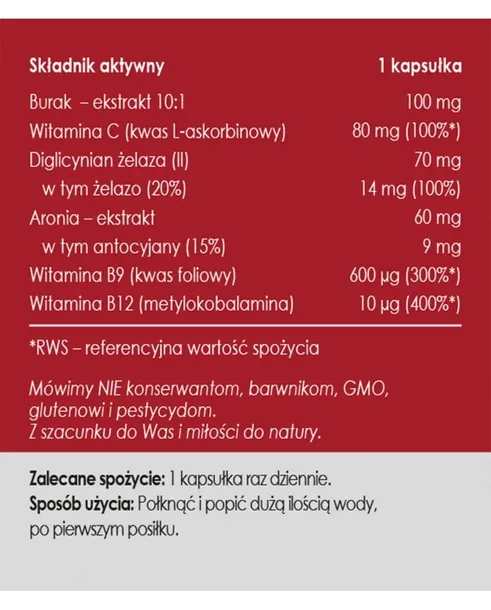 Składniki: ekstrakt z korzenia buraka (Beta vulgaris) 10:1, substancja wypełniająca (celuloza mikrokrystaliczna), kwas L-askorbinowy (witamina C), diglicynian żelaza (II) (żelazo), ekstrakt z owoców aronii (Aronia melanocarpa) standaryzowany na zawartość 15% antocyjanów, substancja wypełniająca:fosforan wapnia; kwas pteroiloglutaminowy (witamina B9), metylokobalamina (witamina B12). Skład kapsułki: celuloza roślinna (wegetariańskie). Podmiot odpowiedzialny: YANGO Sp. z o.o., ul. Granitowa 3/14, 02-681 Warszawa. Wyprodukowano w UE. Masa netto: 24,5g.